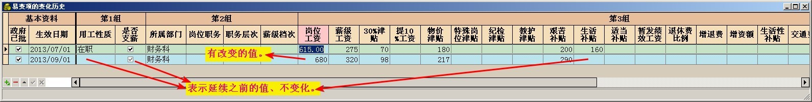 针对第三烦,用户可以易于变化的项目设为"易变项",记录它随日期变化的数值。例如"岗位工资"在2010/03/15升为590元,到了2013/09/20升为680元,有了这个历史过程,系统知晓任一天的数值,可以进行分段计算,可以还原当时的计算过程。有了易变项的时间追踪,再不怕别人来查工资了。