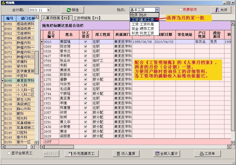 4. 工资分成多批,每批的性质又分为:基本工资、绩效工资、补发工资,每种都有不同的逻辑。例如"补发工资"就是针对机关事业单位,呈报工资异动而审批滞后,批复后要进行工资补发差额而设的。