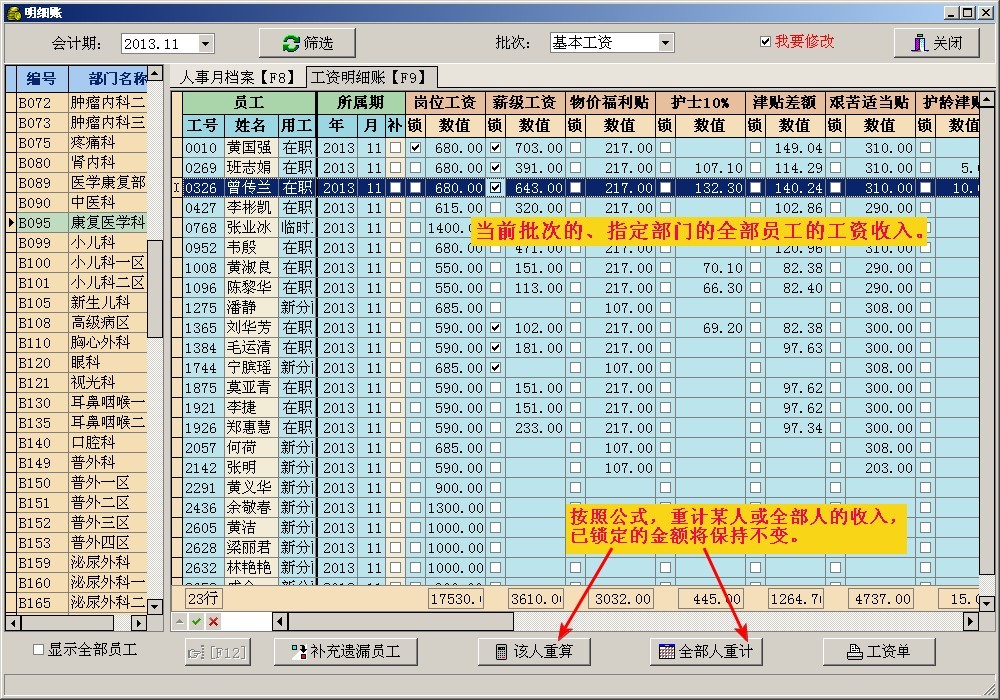 3. 工资项目既可以按公式计算,又可以人手录入,计算后也能修改(并锁定)。竖向排列人、横向排列项目的做法,方便阅读与修改,再加上过滤、分组,操作友好自然。