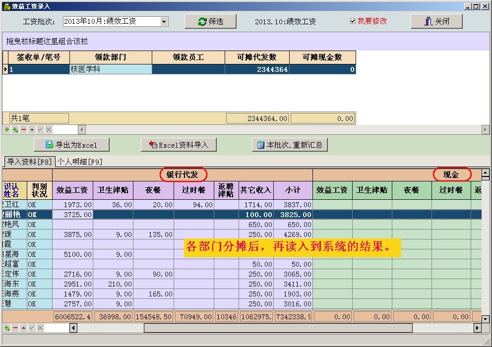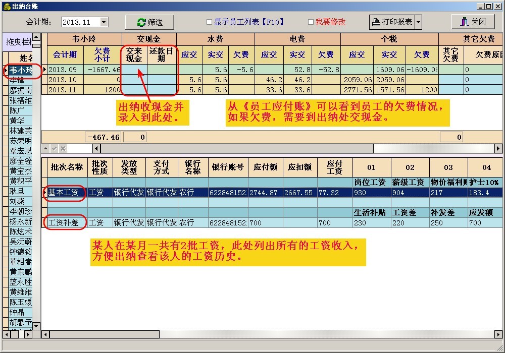 6. 工资明细账导出到《出纳账》,由出纳归并多批工资送银行代发。对于太大的扣款项(个税、水电费等)可以人为调小,然后由出纳收现金。